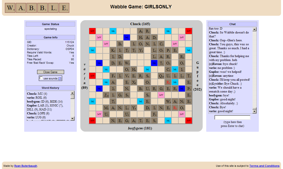 Gupfee ended up winning the Scrabble game. And despite the fact we said "what happens in girl scrabble stays in girl scrabble" doesn't mean that the people who weren't able to attend shouldn't see the chatlog (even if they are boys). Just please don't get us into trouble by telling Chuck we showed you, okay?