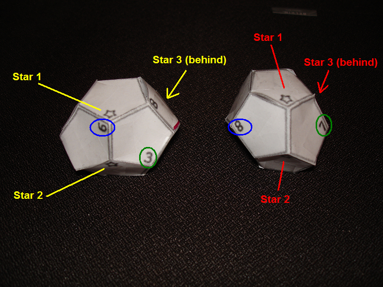 For those who are still helplessly confused, I took a couple of pictures of my slightly crumpled and lopsided dice. The first photo shows the two stars that are connected by the edge, with the third star out of view on the right side of the dice. The circled numbers show the matched up numbers: the 6 on the left matches to the 8 on the right, while the 3 matches with the 7. The second photo shows the dice rotated so that you can see the first and third stars. You can see the mark I made on the 8 to show that it was the left die. In this orientation, you can see the 8 matches the 9 and the 5 matches the 1. To get the rest of the numbers, just make sure you turn the dice together so that the position of the stars match across both dice.
