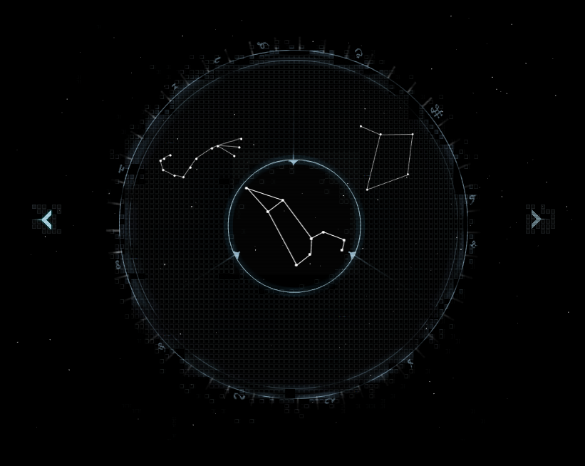 Once you're connected, you are presented with a star field where the 12 Zodiac constellations can be selected by using the arrows to scroll through the sky. After selecting any three constellations, the program attempts to send the "combination" to unlock the controls of the satellite. This is what Gideon's access code was - the series of three constellations that would unlock the CLEO satellite.