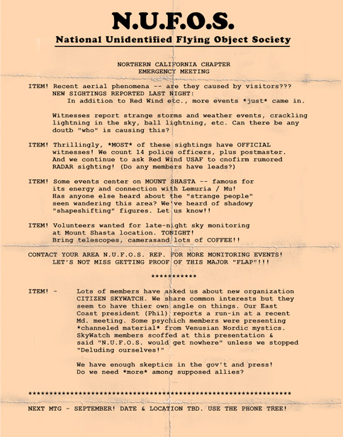 So it seems that Citizen Skywatch doesn't always get along with other Unexplained Phenomenon groups. Apparently other organizations just aren't as displined, dedicated (and of course as cool) as Citizen Skywatch. Seems to be a bit like the pot smack talking the kettle, but what do I know? At the very least, the Northern California chapter of N.U.F.O.S. got about the same amount of information on the Red Wind incident as Citzen Skywatch, so they can't be complete deluded crackpots.